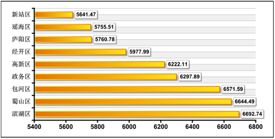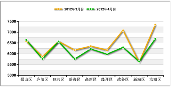 區(qū)屬2012年3月份2012年4月份漲跌情況蜀山區(qū)6577.116644.491.02%廬陽區(qū)5874.145760.78-1.93%包河區(qū)6576.496571.59-0.07%瑤海區(qū)6168.835755.51-6.70%高新區(qū)6354.436222.11-2.08%經(jīng)開區(qū)6167.985977.99-3.08%政務(wù)區(qū)7090.166297.89-11.17%新站區(qū)5611.565641.470.53%濱湖區(qū)7355.616692.74-9.01%全市6337.376219.40-1.86%