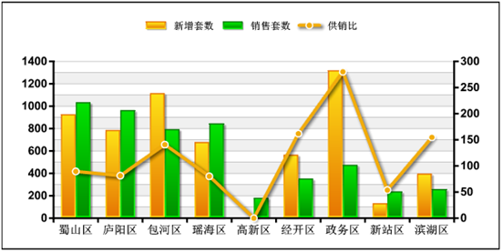4月份期間高新區(qū)沒有新增住宅類商品房,而其他各區(qū)的新增量均保持較高的狀況,其中有六區(qū)的新增量是超過了500套,而且包河區(qū)和政務(wù)區(qū)的新增量超過了1000套,蜀山區(qū)的新增量也接近于1000套。本月期間多區(qū)新增量出現(xiàn)上漲的主要原因是由于本月期間有大量新增項目的影響,而本月期間大部分區(qū)屬的供銷狀況呈現(xiàn)了供小于求的局面,只有包河區(qū)、經(jīng)開區(qū)、政務(wù)區(qū)和濱湖區(qū)受到了大量新增項目的影響是呈現(xiàn)供大于求的局面。