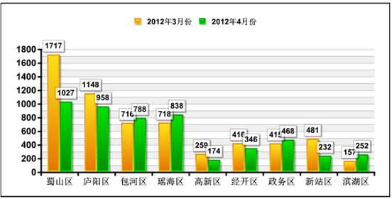 區(qū)屬2012年3月份2012年4月份環(huán)比蜀山區(qū)17171027-40.19%廬陽區(qū)1148958-16.55%包河區(qū)71678810.06%瑤海區(qū)71883816.71%高新區(qū)259174-32.82%經(jīng)開區(qū)416346-16.83%政務(wù)區(qū)41546812.77%新站區(qū)481232-51.77%濱湖區(qū)15725260.51%