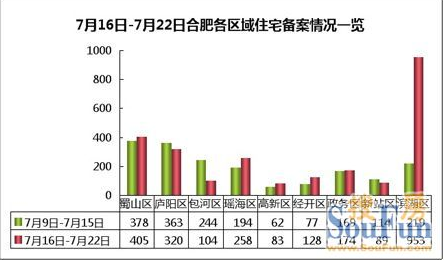 濱湖區(qū)銷量連登九區(qū)榜首 2012年7月16日-7月22日合肥住宅類商品房的總備案套數(shù)為2514套,備案量環(huán)比增長38.13%,年后單周備案量首次破兩千套;其中7月17日備案量高達762套,這是年后首次單日備案超700套。
