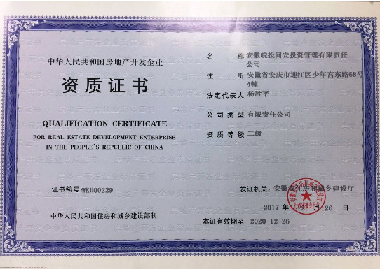 2018年1月2日,安徽省住建廳傳來喜訊,經(jīng)過市住建委和省住建廳審核,皖投同安公司成功晉升為房地產(chǎn)開發(fā)二級資質(zhì)企業(yè)。