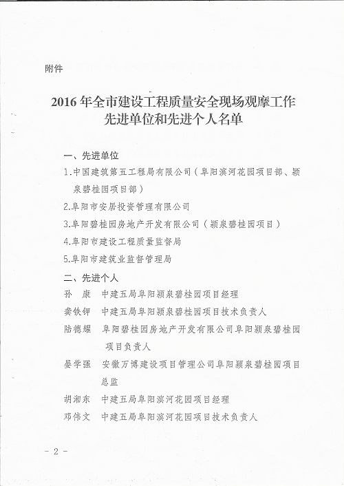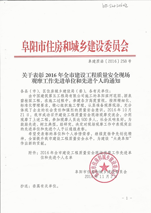 濱河花園項目2016年10月21日成功召開建設(shè)工程質(zhì)量安全現(xiàn)場觀摩會,參加觀摩人員達500多人,社會反響良好。因在本次現(xiàn)場觀摩會工作中表現(xiàn)突出,被阜陽市住房和城鄉(xiāng)建委授予全市建設(shè)工程質(zhì)量安全現(xiàn)場觀摩工作先進單位和先進個人,并進行全市通報表彰。