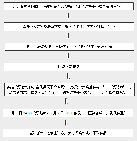 參與投票的網(wǎng)友,留下真實的聯(lián)系方式后會收到合房網(wǎng)的短信,憑短信至天下錦城營銷中心即可獲得皖投置業(yè)提供的精美禮品一份和頒獎典禮的抽獎券。