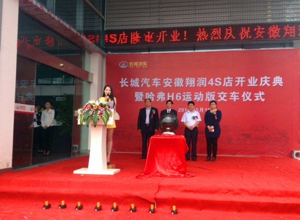 2014年5月18日,長城汽車安徽翔潤4S店開業(yè)慶典暨哈弗H6運(yùn)動(dòng)版交車儀式在蚌埠(皖北)國際汽車城盛大舉行。4S店董事長兼總經(jīng)理陳文鋼一行出席慶典儀式。