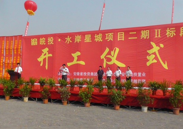 2013年8月18日上午,皖投•水岸星城項目旌旗招展,彩旗飄揚,項目二期二標段舉行開工儀式。皖投置業(yè)、安徽建工集團、河南卓越工程管理有限公司領(lǐng)導及有關(guān)人員參加了慶典儀式。