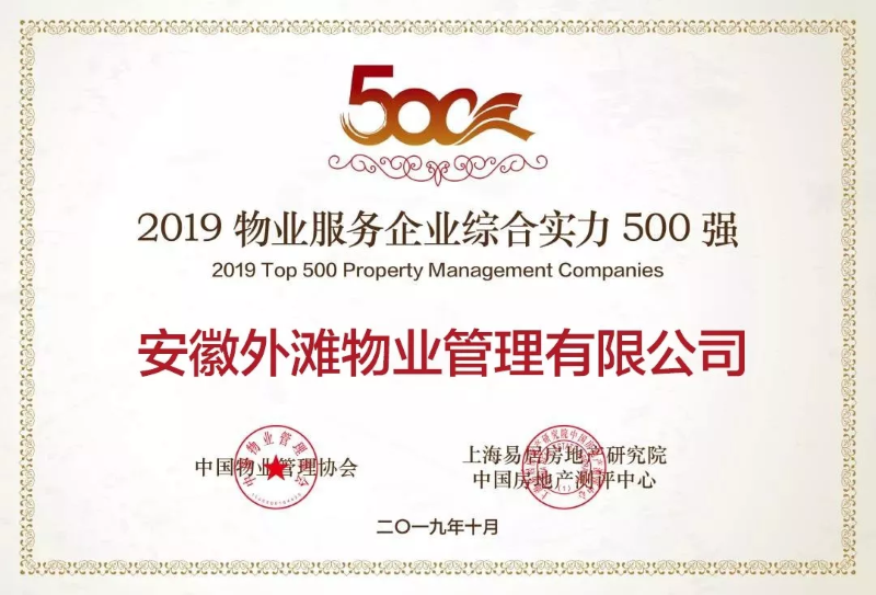 2019年10月15日,由中國物業(yè)管理協會、上海易居房地產研究院中國房地產測評中心聯合舉辦的“第三屆國際物業(yè)管理產業(yè)博覽會暨第五屆中國物業(yè)管理創(chuàng)新發(fā)展論壇”在深圳會展中心成功舉辦。會議現場,中國物業(yè)管理協會發(fā)布了《2019物業(yè)服務企業(yè)發(fā)展指數測評報告》,并公布了“2019物業(yè)服務企業(yè)綜合實力500強”。安徽外灘物業(yè)管理有限公司憑借在經營情況、管理規(guī)模、盈利能力、服務體系以及其他綜合的出色表現,實力上榜。