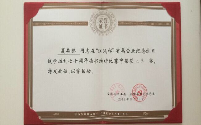 2015年8月21日,由省關(guān)工委、省國(guó)資委黨委、省國(guó)資委關(guān)工委聯(lián)合舉辦的大型演講比賽在江汽集團(tuán)研發(fā)中心隆重舉行,三十余家省國(guó)資企業(yè)參賽,經(jīng)過(guò)激烈角逐,代表我司及集團(tuán)公司參賽的夏榮驕同志以一篇《回憶里選擇未來(lái)》打動(dòng)了評(píng)委及現(xiàn)場(chǎng)觀眾,獲得評(píng)委高度贊揚(yáng)并榮獲二等獎(jiǎng),充分展示了國(guó)企員工的風(fēng)采,為集團(tuán)公司和我司爭(zhēng)得了榮譽(yù)。