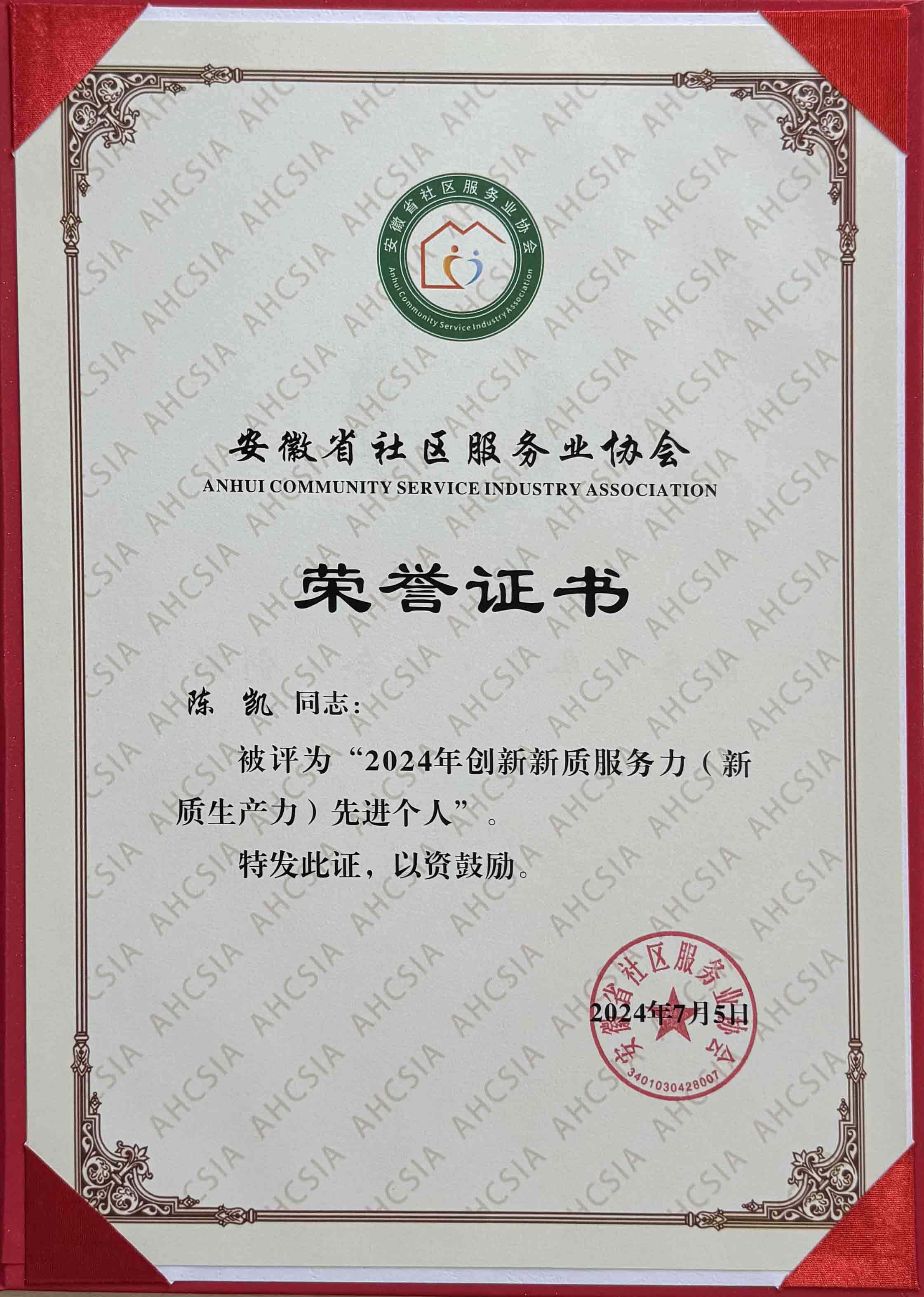 皖投服務(wù)公司榮獲“2023年度安徽省社區(qū)服務(wù)業(yè)協(xié)會(huì)突出貢獻(xiàn)單位”,陳凱同志被評(píng)為“2024年創(chuàng)新新質(zhì)服務(wù)力(新質(zhì)生產(chǎn)力)先進(jìn)個(gè)人”。